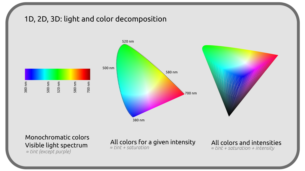It’s been implied so far that a color as we perceive it is physically defined by three independent parameters: its intensity, its dominant wavelength and its Extraction purity.