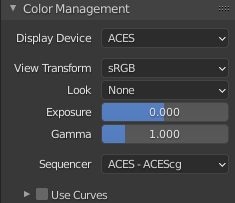 On peut toutefois aussi facilement utiliser une configuration avec ACES si l’on souhaite en profiter ou intégrer Blender à une chaîne de fabrication en ACES, l’espace de travail ACES étant légèrement différent de Filmic.