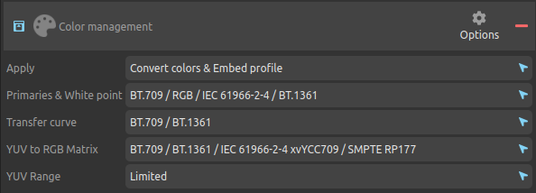 Comme pour l’entrée, en l’absence du bloc Color management, DuME utilise ses propres règles pour “deviner” l’espace à utiliser, en respectant les standards les plus courants, ce qui rend ce bloc optionnel si les fichiers en entrée sont standards.